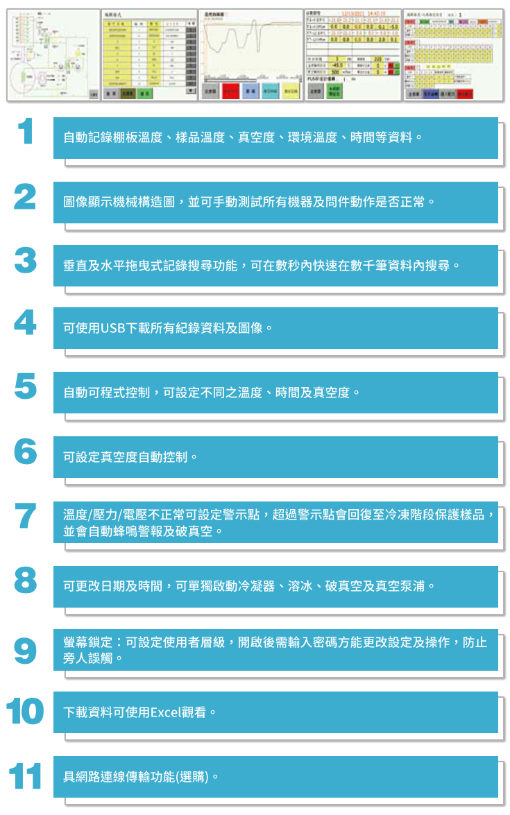 UNISS冷凍乾燥機均使用PLC全自動操作控制器,觸控式操大型彩色液晶螢幕,數字式顯示溫度、真空度、電壓及樣品溫度等各項資料,同時記錄各項數據及時間,並以圖形顯示,使用者可快速瞭解操作期間內是否有異常情形發生;具USB接頭可下載所有操作資料及圖片。此控制器最大的優點在於異常時的警報及防護,當冷凝器、散熱器溫度及真空度過高時會警示,電壓異常警示,真空度異常超過十分鐘後並會自動關閉真空幫浦,防止操作不當等因素造成儀器及樣品毀損樣品可分別監視其溫度,並可藉由其判斷凍結點,因而決定Primary drying及Secondary drying。