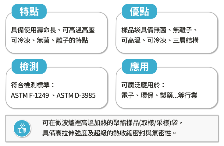 零下56度至115度,在福馬林、甲醛、酸、鹹、油脂、礦物油和有機溶劑介質環境下可以安全使用,且樣品袋透明、氣密、防潮、防臭等。